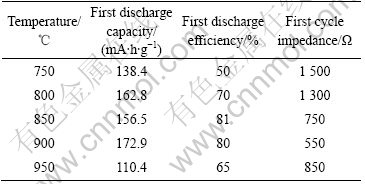 表1 不同温度焙烧10 h合成的Li(Ni3/8Co3/8Mn2/8)O2材料首次循环放电容量和交流阻抗值