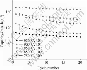 图4所示为不同温度烧10 h合成的Li(Ni3/8Co3/8Mn2/8)O2的0.2C倍率循环寿命曲线。在750、800、850、900和950 ℃焙烧10 h合成的样品循环20次后,其放电比容量依次为105.1、130.5、141.0、166.2和97.5 mA·h/g,分别为首次放电容量的75.9%、80.2%、90.1%、96.1%和88.3%。