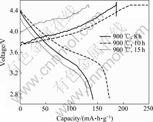 Fig.6 Initial charge-discharge profiles of Li(Ni3/8Co3/8- Mn2/8)O2 synthesized at 900℃ for different times (2.8?4.5 V) at 0.1C