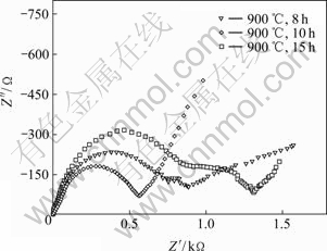 Fig.7 Impedance patterns of Li(Ni3/8Co3/8Mn2/8)O2 synthesized at 900 ℃ for different times