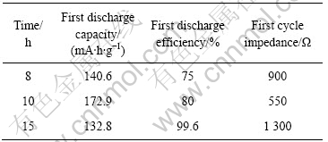 图6所示为900 ℃焙烧不同时间合成的Li(Ni3/8Co3/8Mn2/8)O2的首次充放电容量曲线,首次循环后的交流阻抗图谱如图7所示,首次放电容量、放电效率和交流阻抗数据如表2所示。结果表明,对焙烧8、10和15 h合成的3个Li(Ni3/8Co3/8Mn2/8)O2样品而言,900 ℃焙烧10 h合成的样品具有较低的充电电压平台和较高的放电电压平台、较高的放电容量(172.9 mA·h/g)和较低的交流阻抗(550 Ω)。而焙烧15 h合成的样品虽然放电效率高(99.6%),但放电容量较低(仅132.8 mA·h/g)、并且交流阻抗值高达1 300 Ω,表明锂离子的固相扩散和电化学反应所需的活化能较高。