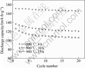 Fig.8 Discharge capacities as function of cycle number of Li(Ni3/8Co3/8Mn2/8)O2 synthesized at 900℃ for different times (2.8?4.5 V) at 0.2C