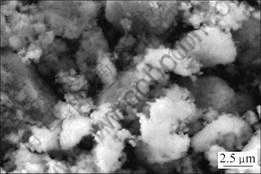 图9所示为900 ℃焙烧10 h后合成的Li(Ni3/8Co3/8Mn2/8)O2的SEM形貌。由图可以看出,合成的Li(Ni3/8Co3/8Mn2/8)O2粉末样品的平均粒径约为4.5 mm,由小晶粒附着而成的多晶体,并存在小晶粒的团聚现象。