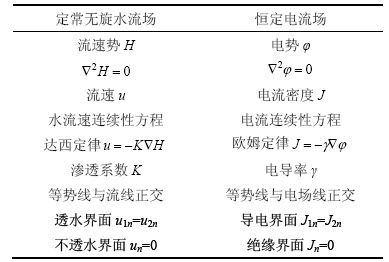 为拉普拉斯算符。可见水流场和电流场的控制方程都是拉普拉斯方程,具有相同的数学形态,因此它们在空间分布上应具有相似的规律[5-6],表1归纳了二者的相似性。