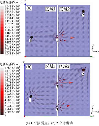 为了验证流场拟合原理,利用电磁场分析软件Ansoft Maxwell建立模型进行仿真。仿真模型如图1所示。图中,区域1和区域2(长×宽为800 mm×500 mm)均为水介质,中间用绝缘且不透水的介质隔开,绝缘介质上有一个长×宽为10 mm×10 mm的渗漏点(图中3号点)。在区域1中施加一个12 V直流电压(图中1号点),在区域2中施加接地点(图中2号点)。箭头方向代表电场强度E的方向,即电流密度J的方向,可见电流密度方向和水流速方向一致。