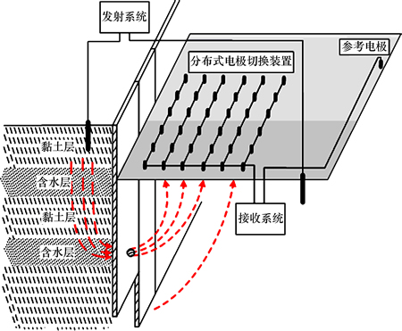 随着城市的发展,高层建筑和地下工程不断增多,这些都需要开挖基坑。基坑渗漏是基坑施工过程中基坑外部的地下水透过地下连续墙渗漏到基坑内部形成的一种常见工程事故。基坑渗漏的危害包括流沙、管涌、突涌等,不仅耽误施工工期而且还可能危害周围建筑物和地下管线的安全[1-2]。目前常用的基坑渗漏探测方法包括明挖法、高密度电阻率法、温度示踪法、超声波检测法等。明挖法费时费工且破坏性大;高密度电阻率法作为传统的电阻率反演方法,测量时间 长,数据处理过程比较复杂,而且其反演结果容易受到地下异常导体的干扰;温度示踪法需要在基坑外侧打很多深孔,而且受到必须要有较强渗流存在才能使用这一局限的限制;超声波检测法施工步骤繁琐且难以做到定性定量分析[3]。鉴于此,本文作者根据流场拟合原理研制了一套新型便捷的基坑渗漏检测系统。采用发射系统在地下连续墙两侧发射1 Hz双极性方波信号,在地下连续墙一侧采用分布式电极切换装置和接收系统采集信号;对采集到的1 Hz方波信号做快速傅里叶变换得到1,3,5,7等奇次谐波的幅值,根据谐波幅值绘制出测量区域的电势等位线或电流密度;通过分析电势异常点和电流密度流向确定基坑渗漏处的位置。