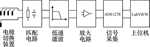 接收系统由分布式电极切换装置、信号调理电路、信号采集电路和上位机软件构成,接收系统模型如图4所示。分布式电极切换装置控制接收电极自动切换至接收线路,信号调理电路实现阻抗匹配以及对信号的滤波和放大,信号采集电路将模拟信号转换成数字信号,上位机软件控制分布式电极切换装置按一定的规律切换,同时对接收到的数字信号进行处理。