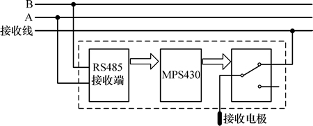 接收信号时,为了提高分辨率需要用到多达几百个接收电极,人工切换电极费时费力。采用分布式电极切换装置,每个接收电极对应分布式电极切换装置上的一个控制单元,控制单元如图5所示,由RS485芯片、MSP430单片机和磁保持继电器组成。单片机通过控制继电器切换使接收电极与接收线相连,从而与参考电极组成接收回路接收该电极的电压信号。