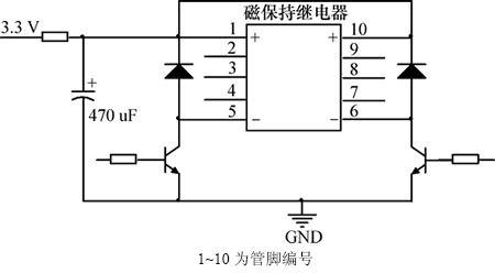 3) TQ2-L2-3V继电器置位、复位时需要40 mA的较大电流,为使供电电流不发生变化在继电器两端增加一个470 μF的储能电容。继电器没有动作时以较小的电流对电容充电,继电器动作时电容通过放电可为继电器动作的瞬间提供能量。