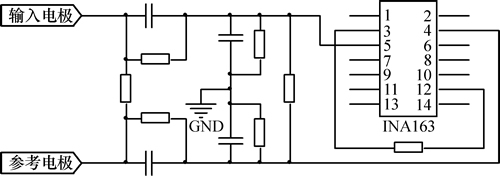 在施工现场,接收信号容易受到噪声干扰,而且信号幅值较小,需要对信号低通滤波和放大。信号调理电路如图7所示,采用差分信号输入方式可以有效减少共模干扰,信号经RC低通滤波电路后由放大器INA163差分放大。