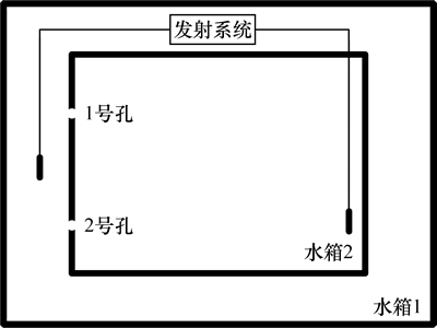 采用室内模拟实验验证本套基坑渗漏检测系统。如图8所示,在绝缘水箱1(长×宽×高为520 mm× 380 mm×330 mm)内放置绝缘水箱2(长×宽×高为400 mm×300 mm×230 mm),2个水箱都灌入水,且水箱2不能被淹没。在水箱2左侧壁开2个孔,2个孔的孔径均为6 mm,用于模拟基坑渗漏点。发射系统在水箱2两侧发射幅值为12 V的1 Hz双极性方波,在水箱2内靠近漏点一侧均匀放置50个接收电极,利用分布式电极切换装置和接收系统采集水箱2内50个接收电极的电压信号并绘制该区域的电势等位线图。
