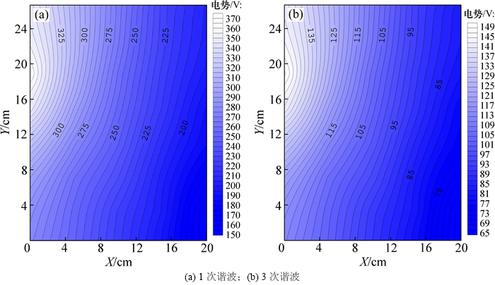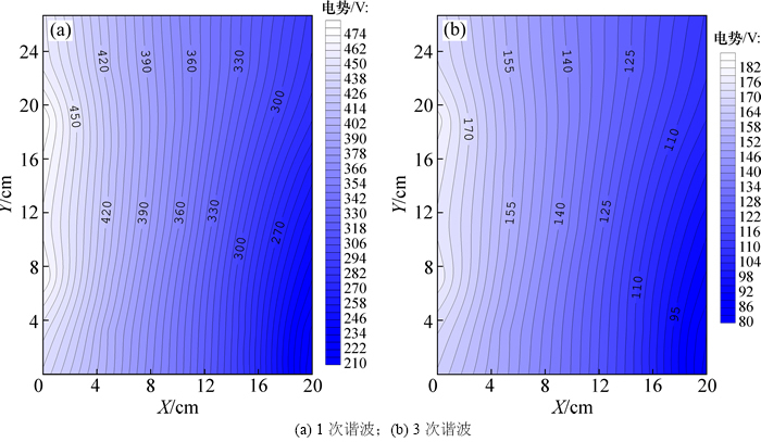 上位机软件由参数设置、 运行测量和数据处理3个部分组成。参数设置部分对采样率、采样点数、文件存储路径和电极编号表格等进行设置;运行测量部分按列切换电极并采集电极电压;运行测量完成后数据处理部分对采集到的电压信号进行快速傅里叶变换,并提取1,3,5和7等奇次谐波幅值,将各电极同一次谐波的幅值存放在一个文件中,最后画出电势等位线图或电流密度图。