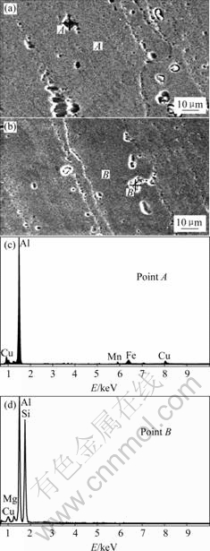In Figs.2(a) and (b), the higher magnification SEM images reveal that critical deformation caused by stress amplitude, coarse recrystallised grains and some relatively large particles. In Figs.2(c) and (d), the energy dispersive spectrometry reveals that most of them are some composite phases consist of aluminum, copper, silicon, iron and manganese, although differences in the contents of these elements were found in the various particles[16]. Moreover, some other particles formed by aluminum-chromium or aluminum- manganese are observed by XRD. The XRD diffraction graph of the plate was composed of α(Al), Mg2Zn, Al13Cr2, Al6Mn, Al86Cr14 and a spot of other diffraction peaks (Fig.3); detection of the finest particles will probably require the use of transmission electron microscope (TEM).