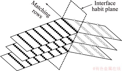 The edge-to-edge matching model was originally developed by ZHANG and KELLY [22,23] for the examination of actual atomic matching across an interface between adjacent phases of diffusion-controlled phase transformations in solids. It has the ability to predict possible orientation relationship (OR) and the corresponding habit plane/interface with matrix from the first principles. The model is based on a critical assumption that the interfacial crystallographic features are governed by the minimization of the interfacial strain energy through the maximization of atomic matching in the two phases. In general, the atomic row-matching condition can be fulfilled when the atomic rows along the edges of a pair of conjugate crystallographic plane meet at the interface, as shown in Fig. 1 [22,23]. To maximize the atomic matching along the parallel rows, the matching rows should be close packed (CP) or nearly CP directions with small interatomic spacing misfit (fr). The value of fr should be less than 10% for a reproducible OR. The matching rows can be either straight or zigzag but the model requires that straight rows match with the straight rows, while zigzag rows match with the zigzag rows. In addition, the conjugate planes containing the matching rows should be a pair of CP or nearly CP planes with similar interplanar spacings. They are termed matching planes. The smaller the interplanar spacing mismatch (fd<10%) is, the easier the interface meets the row-matching requirement. Once the above conditions are fulfilled, an energetically favourable OR between the two phases can be constructed and expressed in terms of the parallelism of the matching rows and near parallelism of the matching planes. The accuracy of the OR and the orientation of the interface can be further refined by using the △g parallelism criterion [24,25].