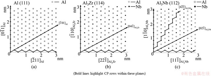 . The atomic configurations of Al, Al3Zr and Al3Nb within their most CP planes are schematically shown in Fig. 2.