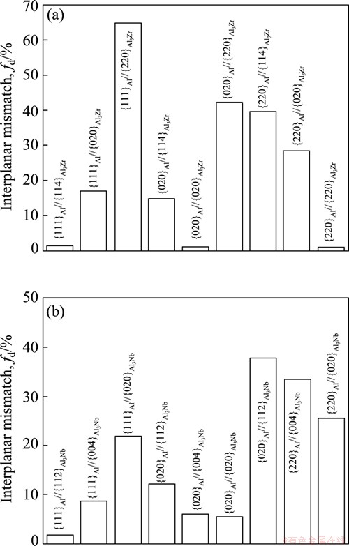 Fig. 3 Interplanar spacing mismatch, fd, between Al and Al3Zr (a) and between Al and Al3Nb (b)