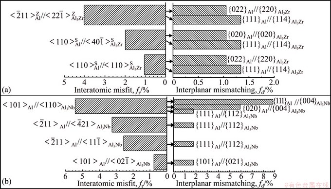 1) Both Al3Zr and Al3Nb have very small values of interatomic spacing misfit along the matching rows and interplanar spacing mismatch between the matching planes with respect to Al, indicating that these two phases are good nucleant particles for Al grains.