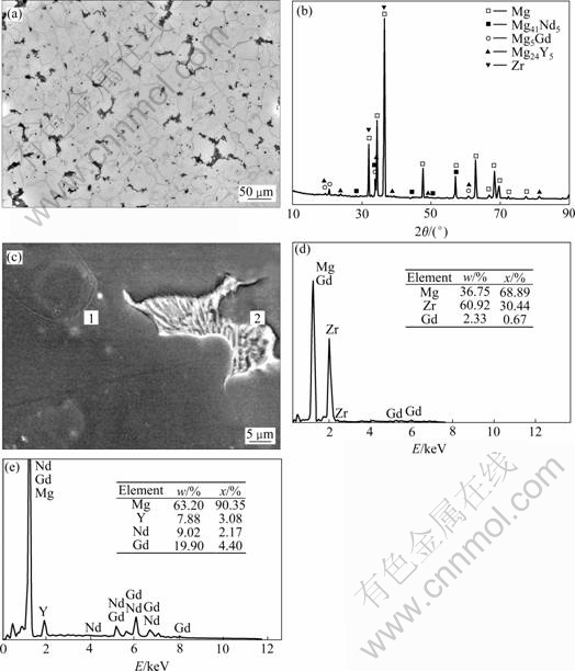 铸态合金的显微组织、XRD谱与EDS谱如图2所示。由图2可看出,合金由α-Mg基体和骨骼状的共晶组织构成,平均晶粒尺寸在35 μm左右(见图2(a))。通过XRD分析可知,除基体外,合金主要的相为Mg24Y5、Mg5Gd及Mg41Nd5(见图2(b))。对合金中骨骼状的共晶组织进行扫描电镜观察(见图2(c))和能谱分析(见图2(d)和(e)),可知共晶组织主要由Mg-Nd- Y-Gd四元素混合相构成,并没有Zr元素。Zr常作为合金形核的核心,起到细化组织的作用[14]。合金在凝固过程中,首先形成树枝状的先共晶α-Mg基体,树枝主干及二次枝晶长大时,溶质原子被排到界面附近的液相中,当富集达到共晶成分时便凝固形成共晶。