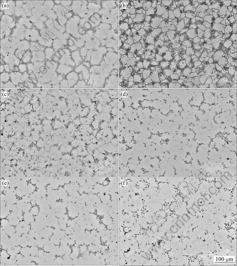 Fig.3 Microstructures of GWN751K magnesium alloy after heat treatment at different temperatures for 6 h: (a) 380 ℃; (b) 400 ℃; (c) 420 ℃; (d) 440 ℃; (e) 460 ℃; (f) 480 ℃