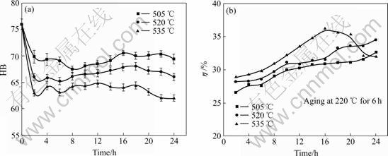 Fig.4 Change curves of hardness(a) and aging hardening efficiency(b) of GWN751K alloy with time at different homogenization situations