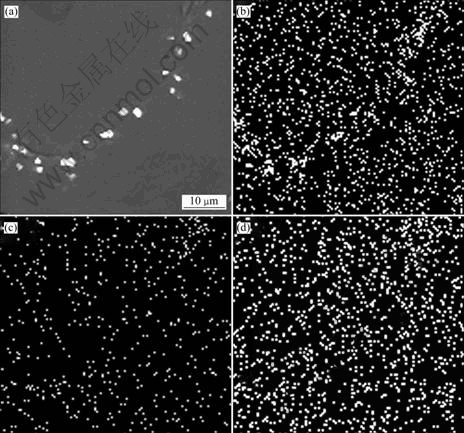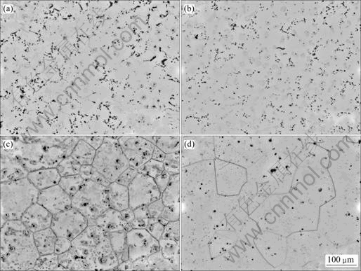Fig.5 Microstructures of GWN751K alloys at different homogenizating temperatures and times: (a) 440 ℃, 6 h+505 ℃, 24 h; (b) 440 ℃, 6 h+520 ℃, 24 h; (c) 440 ℃, 6 h+535 ℃, 16 h; (d) 440 ℃, 6 h+535 ℃, 24 h