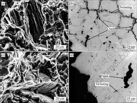 合金的断口形貌及附近显微组织如图7所示。由图7可看出:铸态合金的断裂主要以脆性断裂为主,存在少量的韧窝和撕裂棱(见图7(a));合金的二次裂纹主要存在于晶界处,特别是在共晶组织中(见图7(b)),同时还发现了孪晶。室温条件下合金塑性变形需要5个独立的滑移系,而镁是密排六方结构,室温下仅有3个滑移系,因此孪晶成为其重要的变形机制;经过均匀化后,共晶组织消失,沿晶的二次裂纹也明显减少,合金的韧窝的数量有所增加,塑性提高(见图7(c));二次裂纹主要萌生于晶粒内部(见图7(d))。
