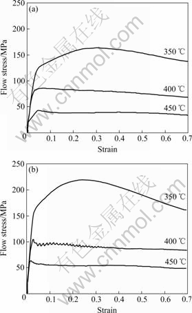 Fig.8 Hot deformation curves of GWN751K magnesium alloy with strain rate of 0.01 s?1 before (a) and after (b) homogenization