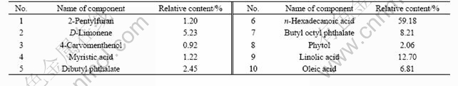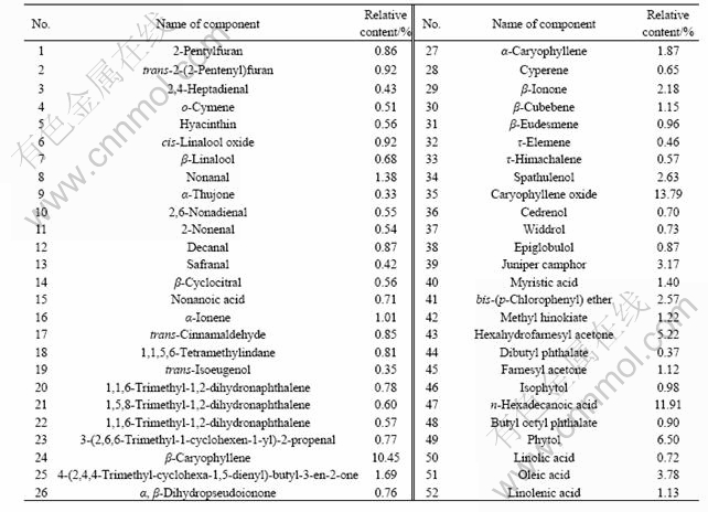 The oil obtained from leaves and barks of C. floribunda were quantitatively analyzed by GC-MS[11]. The total ion current chromatograms of the volatile oil from C. floribunda’s leaves and barks are shown in Figs.1 and 2, respectively. Additionally, the main constituents of the studied volatile oil and relative contents are listed in Tables 1 and 2, respectively.