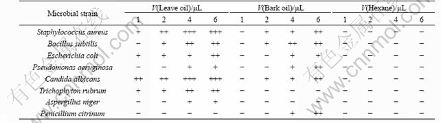 In general, the oils exhibite strong antimicrobial activity. It is notable that a complete inhibition against Candida albicans of leaves oil was observed only at 1 ?L, and an obvious inhibition against Staphylococcus aureus, Bacillus subtilis, Escherichia coli and Trichophyton rubrum was observed at 2 ?L. But it was found to have no suppression against Penicillium citrinum. Though the bark oil showed inhibition against all the tested microbial strains, it occurred only when the content of oil was high; additionally, no inhibition was obtained against the growth of Trichophyton rubrum and Aspergillus niger.