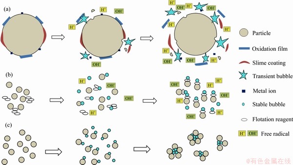 Fig. 1 Effect of ultrasonic transient cavitation(a), stable cavitation(b) and Bjerknes power(c) on mineral flotation