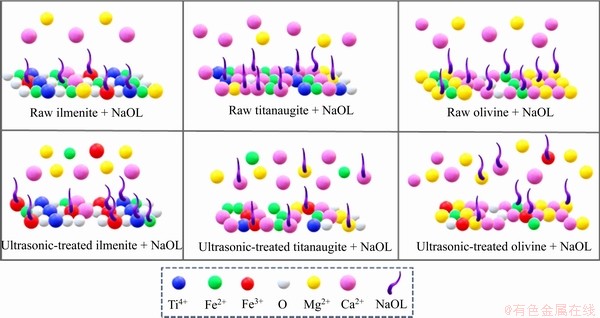 图3 超声处理前后钛铁矿、钛辉石和橄榄石表面NaOL的吸附模型[44]