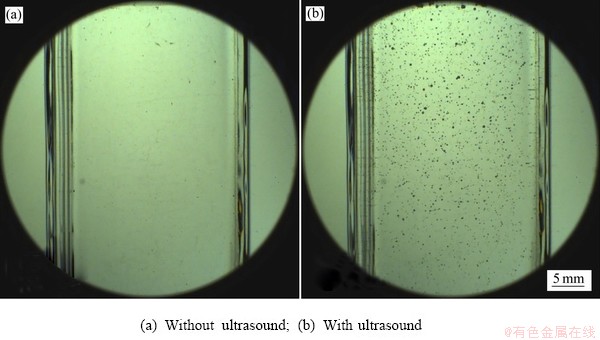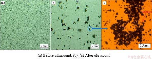 超声稳定空化效应可使矿浆中形成微小的气泡;瞬态空化效应下气泡的破裂也可形成微小的气泡。但只有当液体压力大于整流扩散阈值(从振荡转变为生长的最小压强称为整流扩散阈值)而小于瞬态空化阈值(泡沫的行为由生长变为破裂时的最小压强)时,才会有大量微小气泡形成[12]。控制好超声波的参数,经超声处理后矿浆中泡沫直径明显会减小。在气体流量不变的情况下,气泡尺寸的减小可以提高气泡-矿粒的碰撞效率、气泡-矿粒的附着效率和产生的气泡数,从而有利于提高浮选回收 率[60]。图6显示了超声条件下浮选泡沫尺寸明显减小的情况[61]。要实现矿物的有效浮选,矿浆中需要有足够数量和合适尺寸的泡沫,使目的矿物疏水并附着于气泡上升,实现矿物分选[62]。