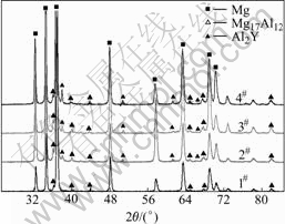 Fig.1 shows the optical micrographs of as-cast alloys. The second-phase in AZ61 alloy is Mg17Al12 phase according to the result of microanalysis by EDS. Mg17Al12 phase shows network shape and distributes mainly at grain boundaries. Also, a black dot-like phase dispersed in grains sparsely can be observed, which is proved to be Al-Mn compound by EDS. It can be seen from Fig.1 that by adding Y, α-Mg dendrites and Mg17Al12 phase can be refined, and the finest average grain size is obtained in alloy 3. Meanwhile, there are more precipitate phase particles dispersing in the grains of Y-containing alloys. The SEM image and line scanning result of this second-phase are shown in Fig.2. It is found that the contents of Al and Y in this phase are much higher than those of the matrix and the atomic ratio of Al to Y is about 2?1. The X-ray diffraction patterns of as-cast alloys are shown in Fig.3, from which the Y-containing phase is verified as Al2Y.