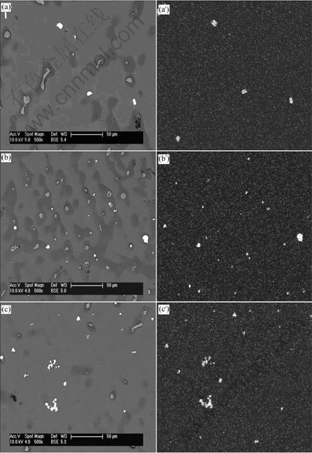 Fig.4 SEM images and Y map distributions of cast Mg-Al-Y-Zn alloys: (a), (a′) Alloy 2; (b), (b′) Alloy 3; (c), (c′) Alloy 4