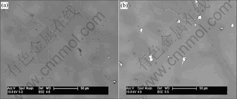 Fig.5 shows the SEM images of the homogenized alloy 1 and alloy 3. After homogenization treatment, Mg17Al12 phase is dissolved in α-Mg matrix, so the amount of the second-phase decreases sharply. When Y is added into the alloy, Al2Y particles with high melting point and elevated temperature stability are almost not dissolved in the α-Mg matrix and they remain the same shape.