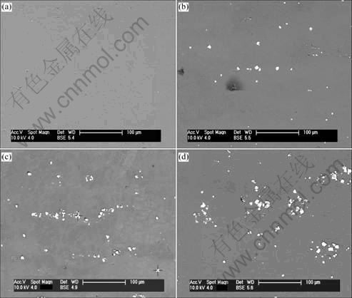 Fig.6 SEM images of alloys rolled at 350 ℃: (a) Alloy 1; (b) Alloy 2; (c) Alloy 3; (d) Alloy 4