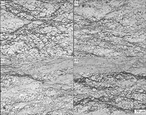 Fig.7 Optical micrographs of alloys rolled at 350 ℃ (longitudinal section): (a) Alloy 1; (b) Alloy 2; (c) Alloy 3; (d) Alloy 4