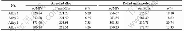 The chemical compositions of the studied alloys are listed in Table 1. The treatment procedures are described as follows. The cast ingots were homogenized at 400 ℃ for 16 h. Then, these plates were heated up to 350 ℃ and kept for 1 h, followed by rolling with heating rollers which were maintained at 100 ℃. 20 mm starting thickness of these plates was reduced down to 1mm, corresponding to the compressive deformation ratio of 95%. Multiple passes and re-heating between them were required. The standard tensile specimens were made from the as-rolled sheets. The rolled sheets were annealed at 250℃ for 1h, and the tensile properties of annealed sheets were also tested. Phase analysis was performed by XRD. Microstructures of experimental materials were observed by optical microscope(OM) and scanning electron microscope(SEM) equipped with energy dispersive spectrometer(EDS)