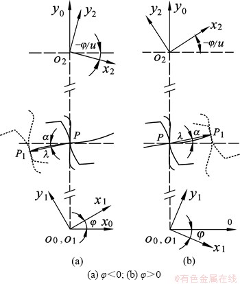 齿轮啮合坐标系如图1所示。齿轮1与坐标系S 1 (O1, x1, y1)相固联,齿轮2与坐标系S 2 (O2, x2, y2)相固联,通过节点P的曲线为啮合线。假设两齿廓接触点从P移动到P1位置,则P1位置的接触点在坐标系S 0 (O0, x0, y0)下的坐标可表示为