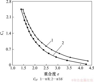 将式(22)和式(23)代入式(13),即可计算得齿轮的重合度。同理,当齿轮的模数m,齿数z1,传动比u,齿顶高系数ha*,顶隙系数C*,系数C0已知时,根据式(22)、式(23)和式(13),可画出系数C1和重合度ε的关系曲线。根据该曲线关系,当重合度确定后,可选择系数C0和C1,将C0和C1分别代入式(14),(15)和(5),可计算得