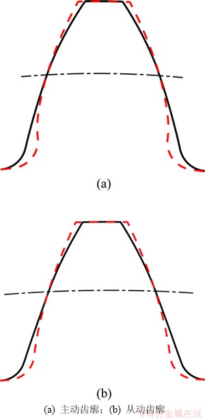 图3所示为高重合度齿轮与渐开线齿轮齿廓对比图,其中,虚线为渐开线齿廓,实线为高重合度齿廓。由图3、式(24)和式(25)可知: