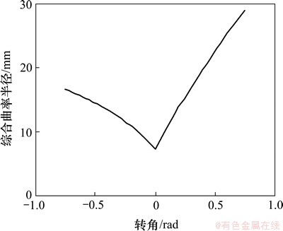图5所示为高重合度齿轮综合曲率半径随转角φ的变化曲线。由图5可知:高重合度齿轮的综合曲率半径很大,根据赫兹公式,两轮齿在接触处的最大接触应力与综合曲率半径成反比[13],故高重合度齿轮在接触点处的最大接触应力较小,对应的接触强度会相应较大。