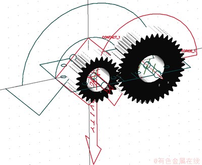 为了分析重合度对齿轮动力学特性的影响,根据Hertz碰撞理论,本文利用Adams软件,对设计实例中的高重合度齿轮进行了动力学分析。分别在两齿轮上施加旋转副,齿轮之间加实体-实体碰撞力,输入轴上加转速驱动,输出轴上加负载转矩,建立的完整动力学仿真模型如图8所示。