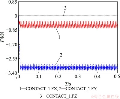 相对于位移的碰撞速度;x1表示位移x自由长度的正实数变量,若x<x1则力赋一个正值,否则力为0 N,x1可以被定义为一个实数、函数或者变量;e表示力的变形特性指数的一个正实变量;Cmax表示最大阻尼系数的一个非负实变量;d表示在施加全阻尼时的边界穿透量。根据设计实例中齿轮参数可计算得阻尼系数C=50 N·s/mm,穿透深度d=0.1mm,k=6.4×105 N/mm,e=1.5。本文取仿真时间为0.5 s,步长为6 000。图9所示为高重合度齿轮啮合力仿真曲线。为了便于比较,图10给出了相同参数的渐开线齿轮的啮合力仿真曲线。