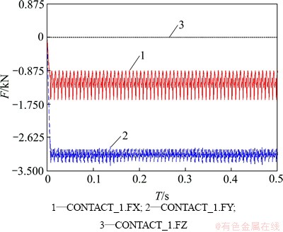1) 与渐开线齿轮传动相同,在仿真开始的瞬间,齿轮突然加速,啮合力随齿轮啮合的进行发生波动,但波峰间距较大,即齿轮啮合周期较长,随着传动的进行,啮合力在一个均值附近以一定的幅值和周期上下波动,周期和幅值趋于稳定,这是齿轮周期性啮入啮出冲击的表现。