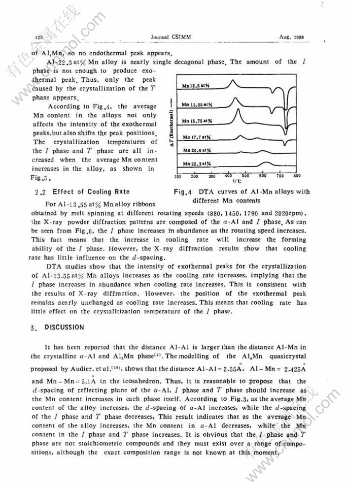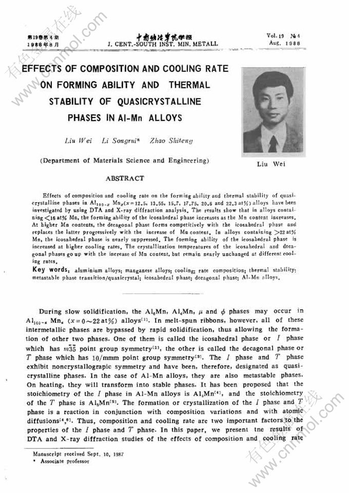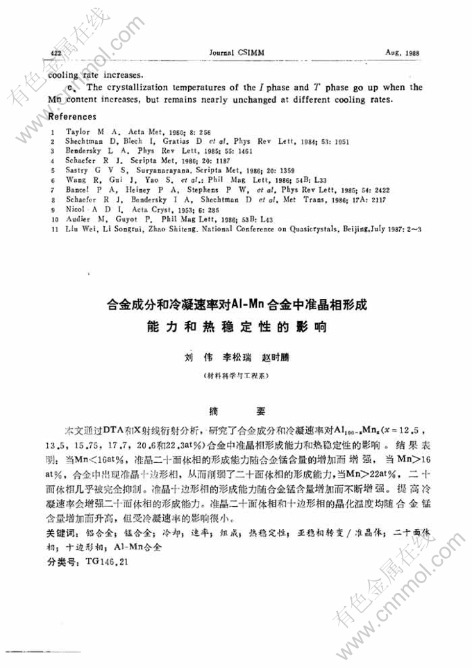 关键词:铝合金; 锰合金; 冷却; 速率; 组成; 热稳定性; 亚稳相转变/准晶体; 二十面体相; 十边形相; Al-Mn合金