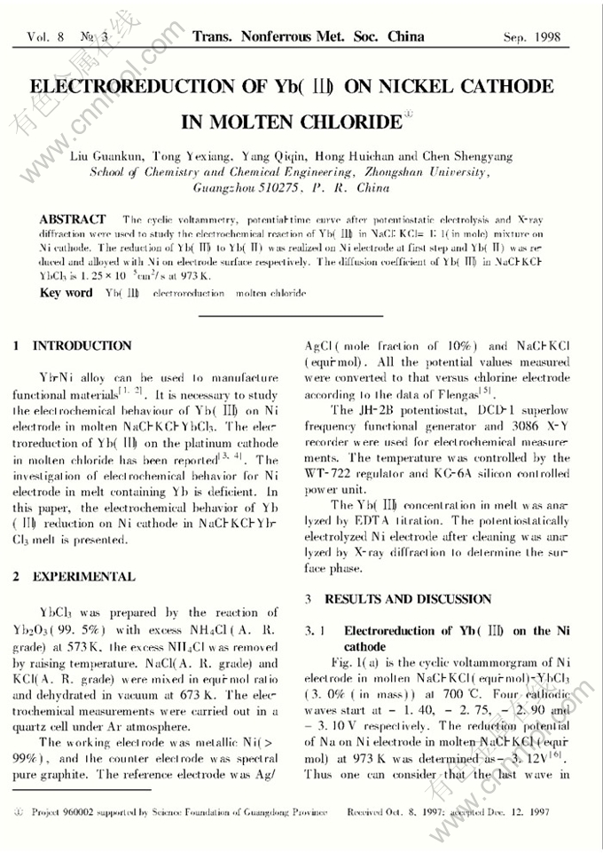 Key words:Yb(Ⅲ); electroreduction; molten chloride