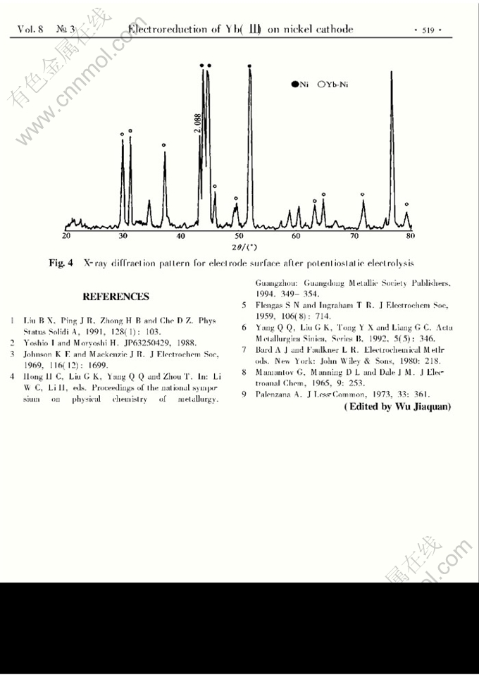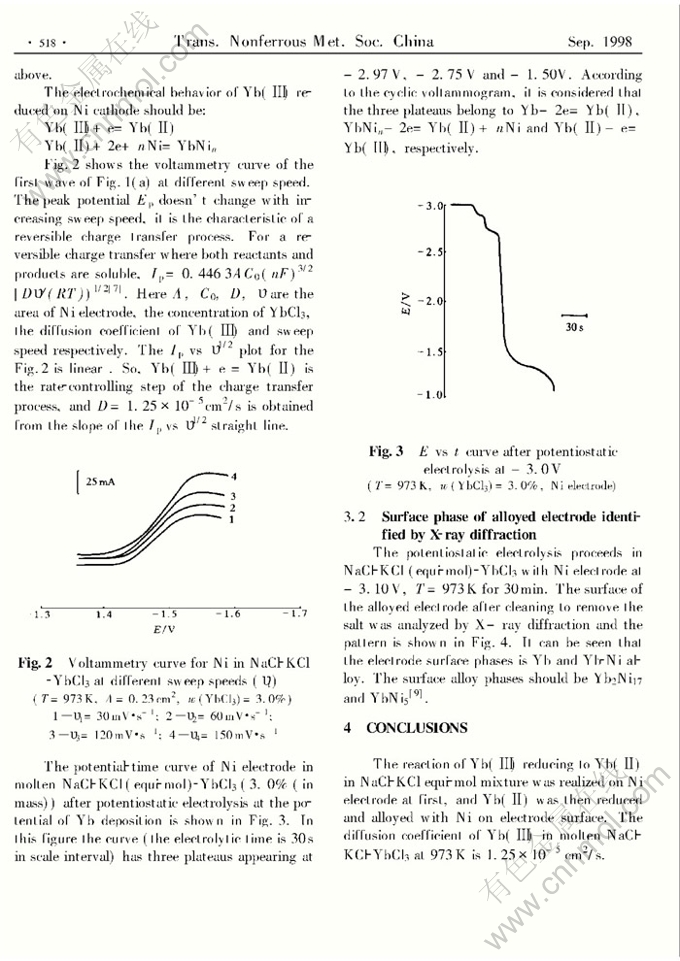 ELECTROREDUCTION OF Yb(Ⅲ) ON NICKEL CATHODE IN MOLTEN CHLORIDE
