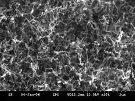 Fig.1 shows the SEM micrograph of a typical sample of carbon nanotubes grown on copper substrate with 0.01 mol/L iron chloride catalyst precursor for about 10 min synthesis duration, indicating the large quantity of carbon nanotubes were achieved by using this approach. These carbon nanotubes have diameters ranging from about 10 to 60 nm and lengths ranging from hundreds of nanometers to several micrometers.