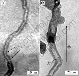 Fig.2 shows the TEM images of carbon nanotubes grown with 0.01 mol/L iron chloride catalyst precursor. Fig.2(a) shows the carbon nanotube has a bamboo-like structure clearly. The black arrows in Fig.2(a) mark the compartment layers. Fig.2(b) shows the compart-